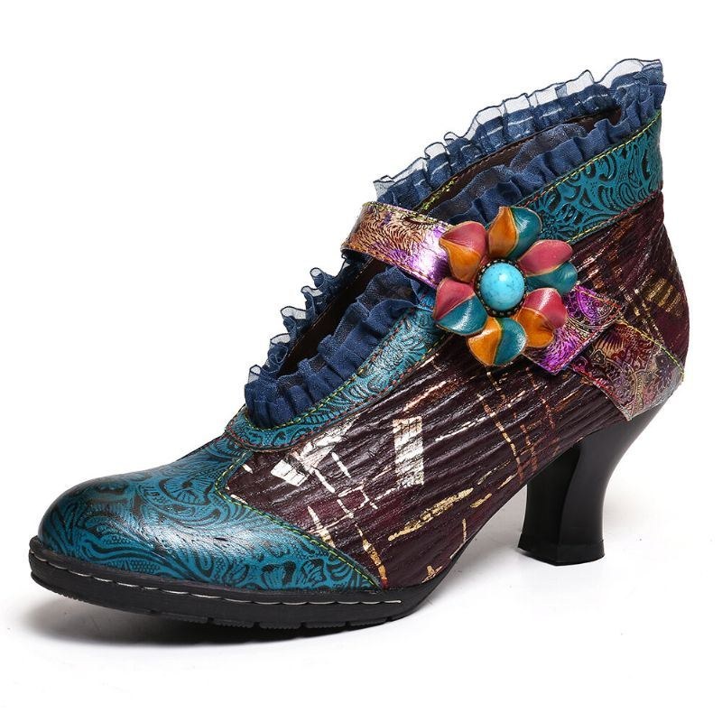 Dame Blonder Ægte Læder Splejsning Blomster Lav Hæl Elegante Pumps