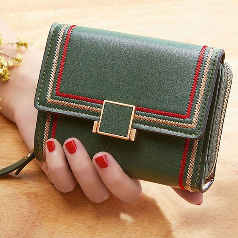 Dame Pu Læder Broderi Multi-card Slot Organ Card Case Kort Trifold Pengeclips Lynlås Møntpung Pung