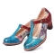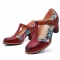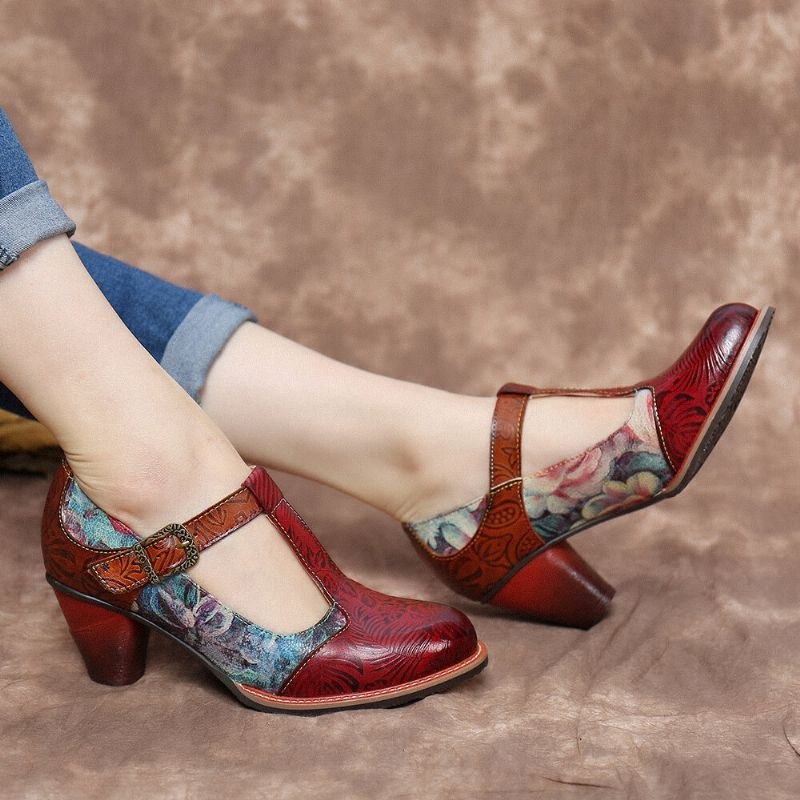 Dame Retro Ægte Læder Blomster Prægede Blade T-strop Chunky Heel Pumps