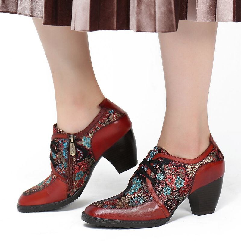 Dame Retro Broderi Blomster Ægte Læder Yndefulde Lynlås Pumper