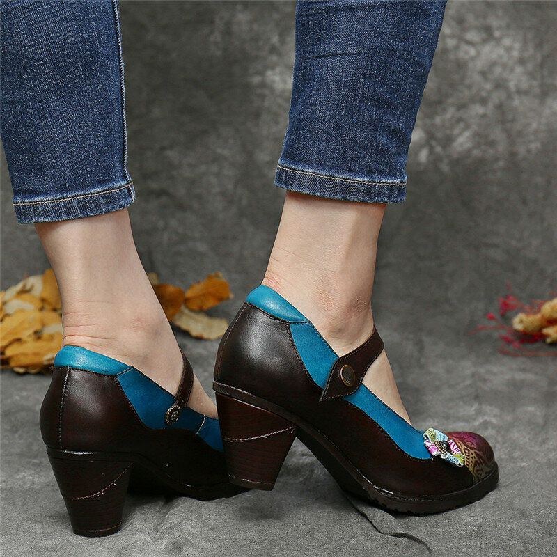 Dame Retro Læder Blomster Splejsning Chunky Heel Pumps Mary Jane Dress Sko