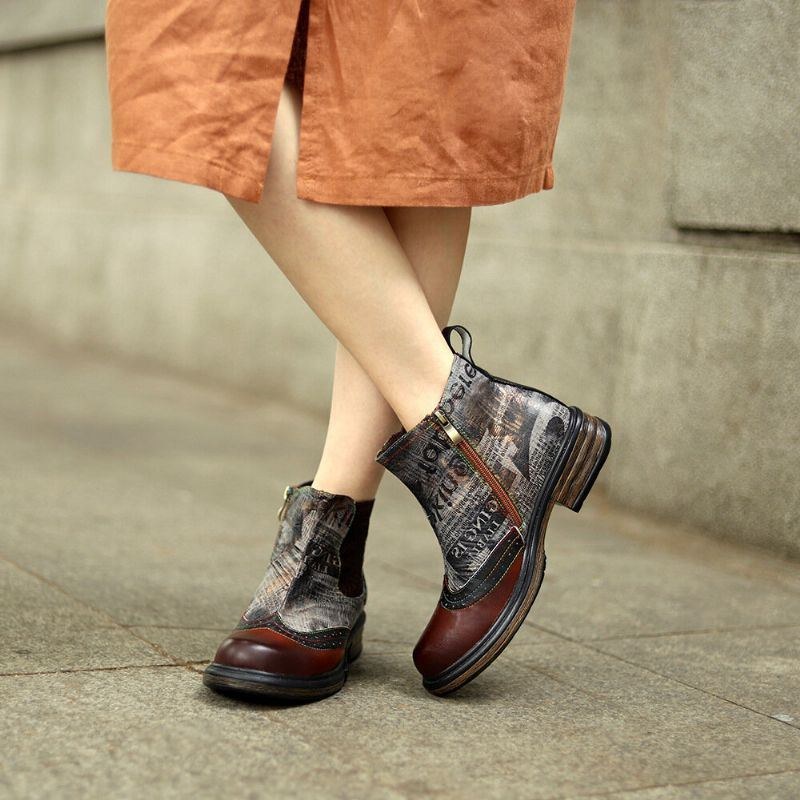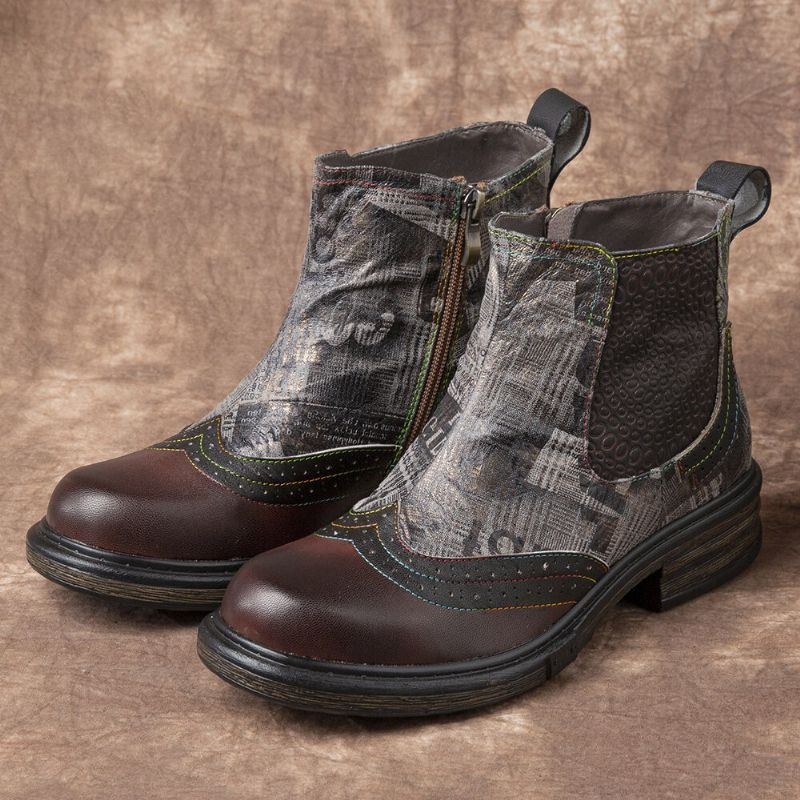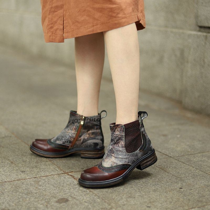 Dame Retrotryk Lædersplejsning Bløde Behagelige Tykke Hæle Ankelstøvler