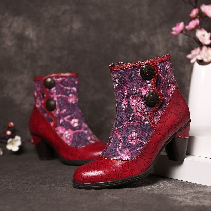 Dameprægede Ægte Læder Splejsning Folkways Blomster Højhælede Lynlåsstøvler